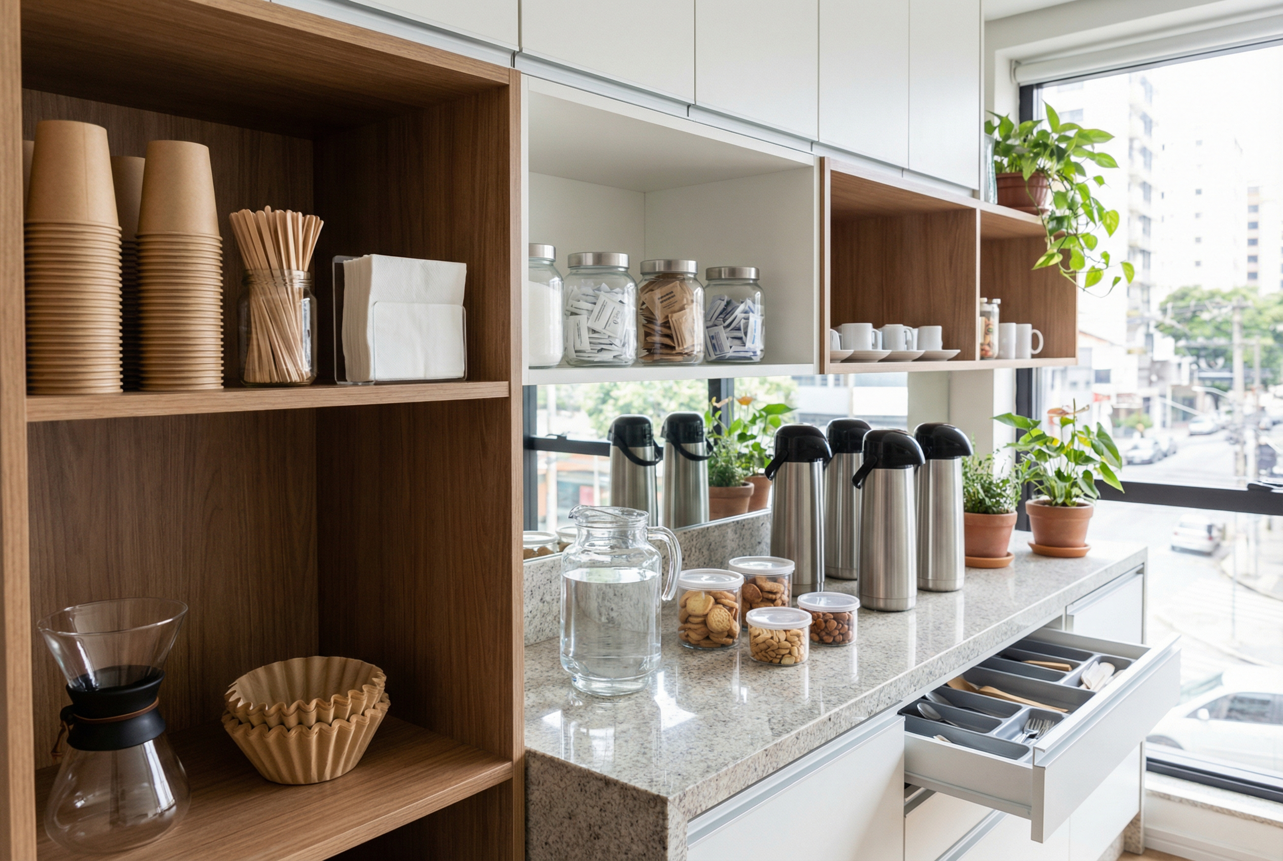 Linha completa de produtos para copa e cozinha, incluindo café, açúcar, adoçantes, cápsulas, chás e itens essenciais para o dia a dia corporativo. Como distribuidores,