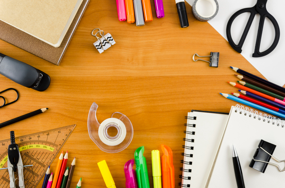 Linha completa de materiais de escritório, incluindo papel sulfite, arquivo morto, envelopes, bobinas, marcadores, pastas, etiquetas, blocos adesivos, fitas, grampeadores, canetas, clipes, entre outros itens