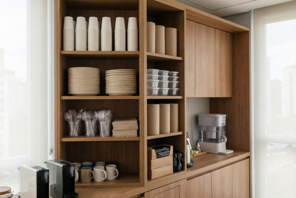 Copos, pratos, talheres e guardanapos com foco em praticidade e higiene.